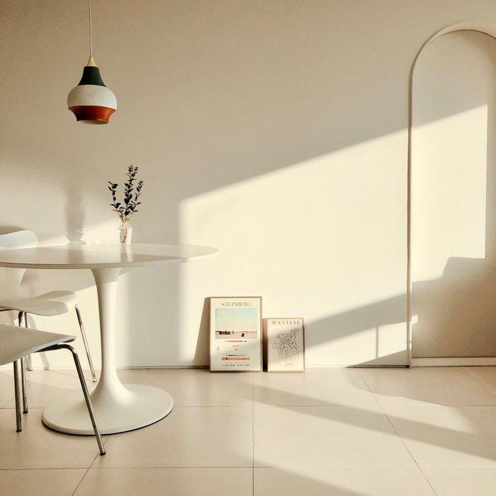 원형 테이블은 3년째 사용하고 있는 이케아의 독스타입니다. 더 저렴한 원형 테이블도 많이 나와있지만 실용적인 부분과 디자인적 부분을 모두 갖춘 제품이라 선택했어요. 상판 재질은 라미네이트라 쉽게 컬러가 깨지거나 이염되지 않아 좋더라구요. 나팔 형태의 베이스도 하부에 묵직한 평철로 조립되어 안정감 있어서 좋구요:) 조금 더 사용하다가 상판을 비앙코 대리석으로 바꿔보고 싶기도 해요.