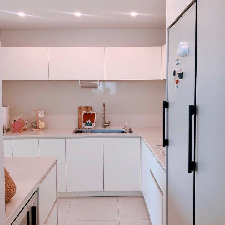 옆에서 툭 튀어나왔던 냉장고를 주방 전면에서 보이는 쪽으로 옮기면서 아일랜드와의 간섭이 없어졌어요. 냉장고가 전면에서 노출되기에 디자인이 깔끔한 비스포크 원도어 냉장고와 냉동고를 빌트인 설치했습니다. 아일랜드 수납장에는 전자레인지를 빌트인하고, 식기류나 덩치 큰 조리 도구를 수납할 수 있도록 만들었어요.