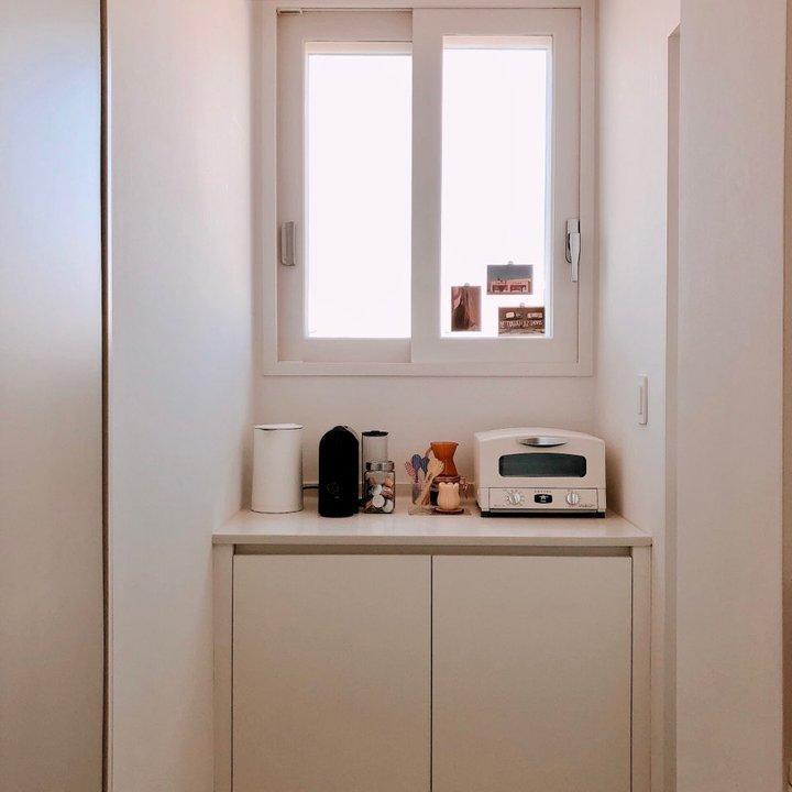 이 공간은 주방에서 오른쪽 세탁실로 들어가는 공간인데요, 위쪽엔 환기가 잘 되는 창문도 있고 꽤나 안으로 깊게 자투리 공간이 남는 것이 아까워서 하부장을 새로 만들어주었어요. 덕분에 비상 식량 수납(;)을 더 많이 할 수 있는 별도의 홈카페 공간으로 마련되었습니다. 하부장 상판은 주방 모두 통일된 인조대리석으로 맞춰주었고요 :)