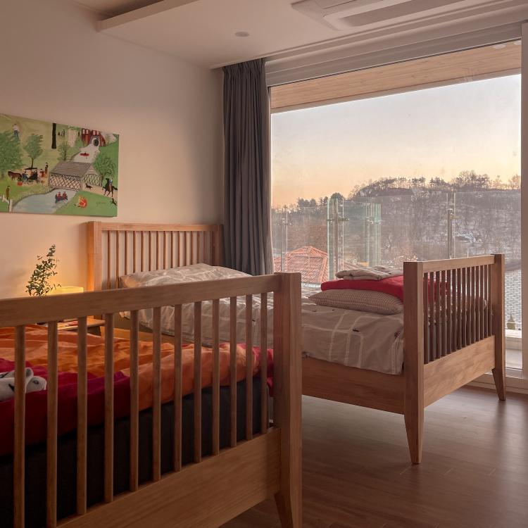 아이들 침실도 마찬가지로 따스한 느낌의 원목 침대 두 개만 두어서 잠을 잘 때는 편안한 동화책 한두 권을 읽다가 잠에 들 수 있도록 했습니다.