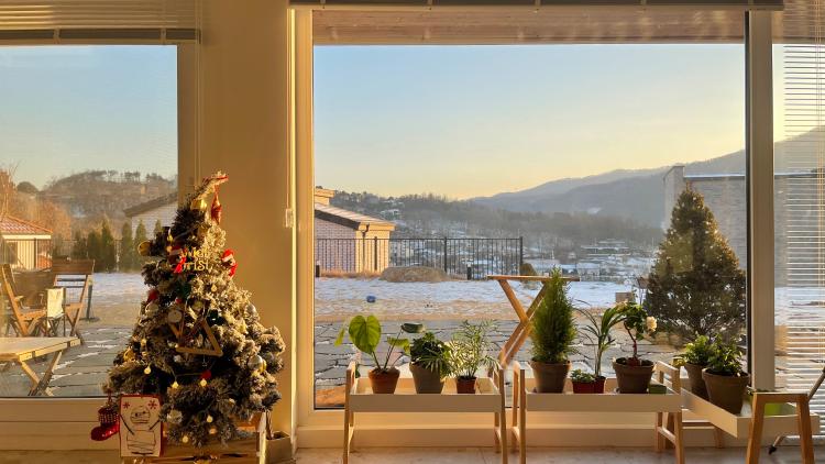 눈이 내려서 겨울 왕국이 되어버린 마당은 여행을 온 느낌이 들게 합니다.
