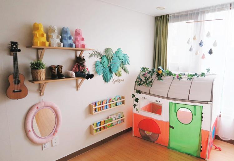 플레이 텐트와 직접 책을 넣고 뺄 수 있는 높이의 간이 책장, 자존감 형성에 도움을 준다는 거울도 깨지지 않는 아크릴 재질로 설치해 주었어요.