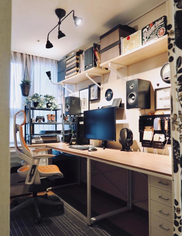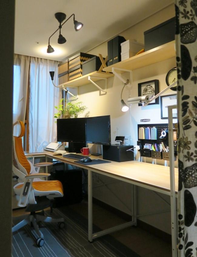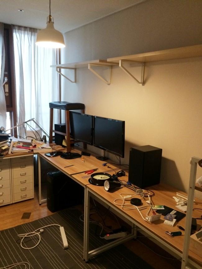 집에 있던 2만 원대의 책상 3개가 운 좋게도 딱 맞게 들어갑니다. 쾌재를 부르며 또 이케아에서 여러 소품들로 채우기 시작합니다. 선반은 대체 몇 개째 달고 있는 건지 모르겠네요...