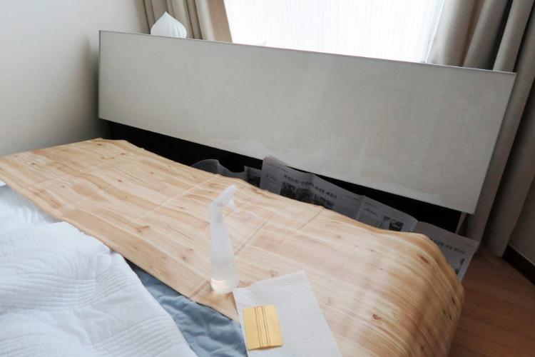 광택이 나는 차가운 느낌의 침대 헤드는 따뜻한 나무 무늬 시트지로 리폼해 주었어요.