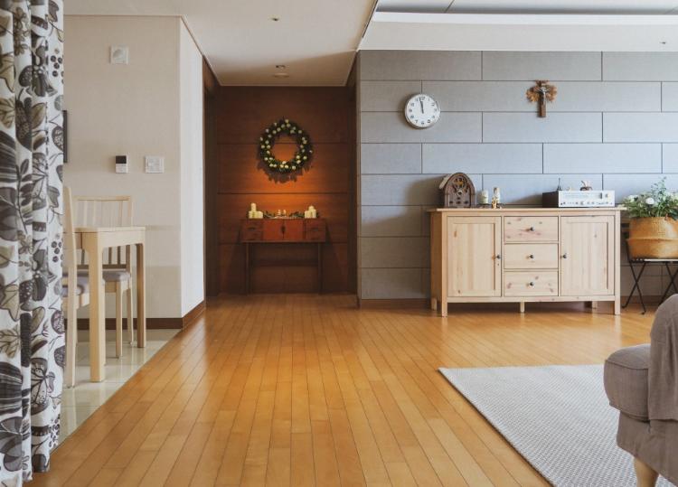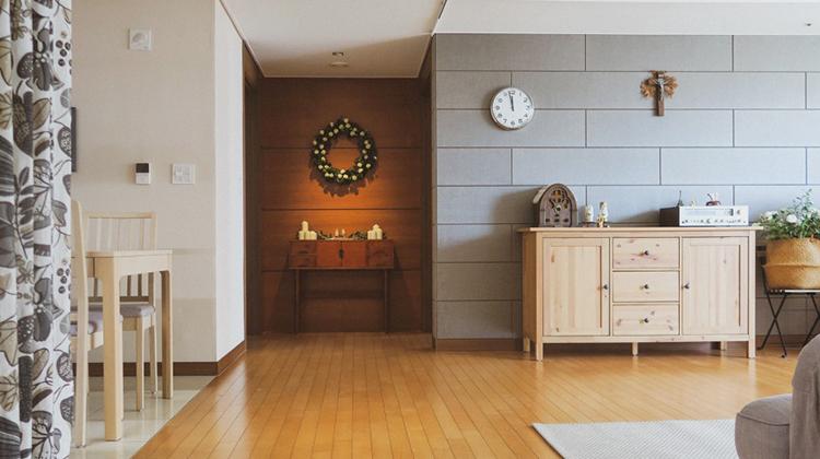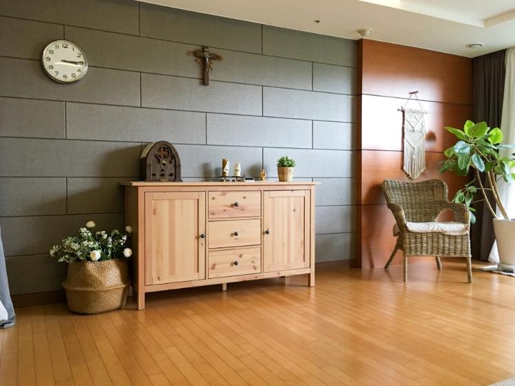 따로 인테리어 공사는 하지 않아서 집안에 체리색이 많이 있어요. 비슷한 체리색의 콘솔장이나 좀 더 밝은 톤의 가구나 라탄 소품, 회색 포인트 윌과 비슷한 컬러의 소파를 선택해 통일감에 중점을 두었습니다.