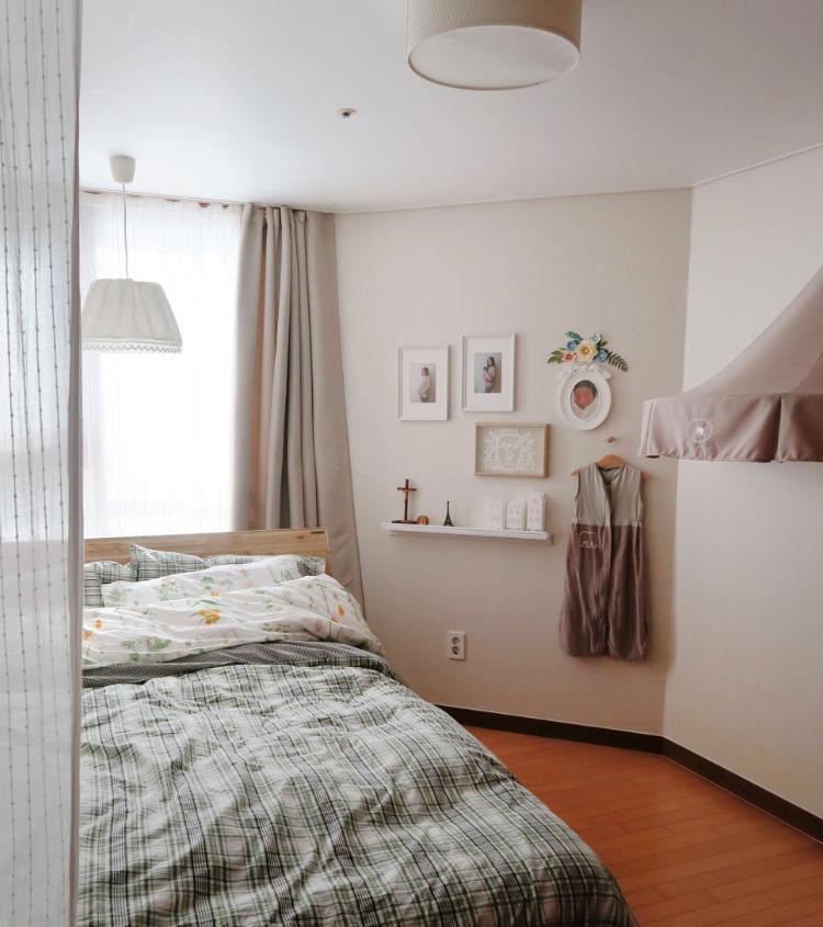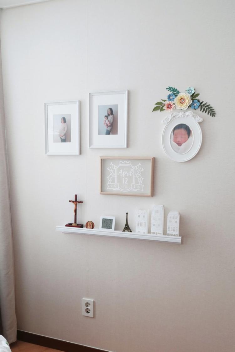 정리된 침실의 모습, 직접 찍어준 와이프의 출산 전/후 모습과 첫째의 사진을 걸어두었습니다.