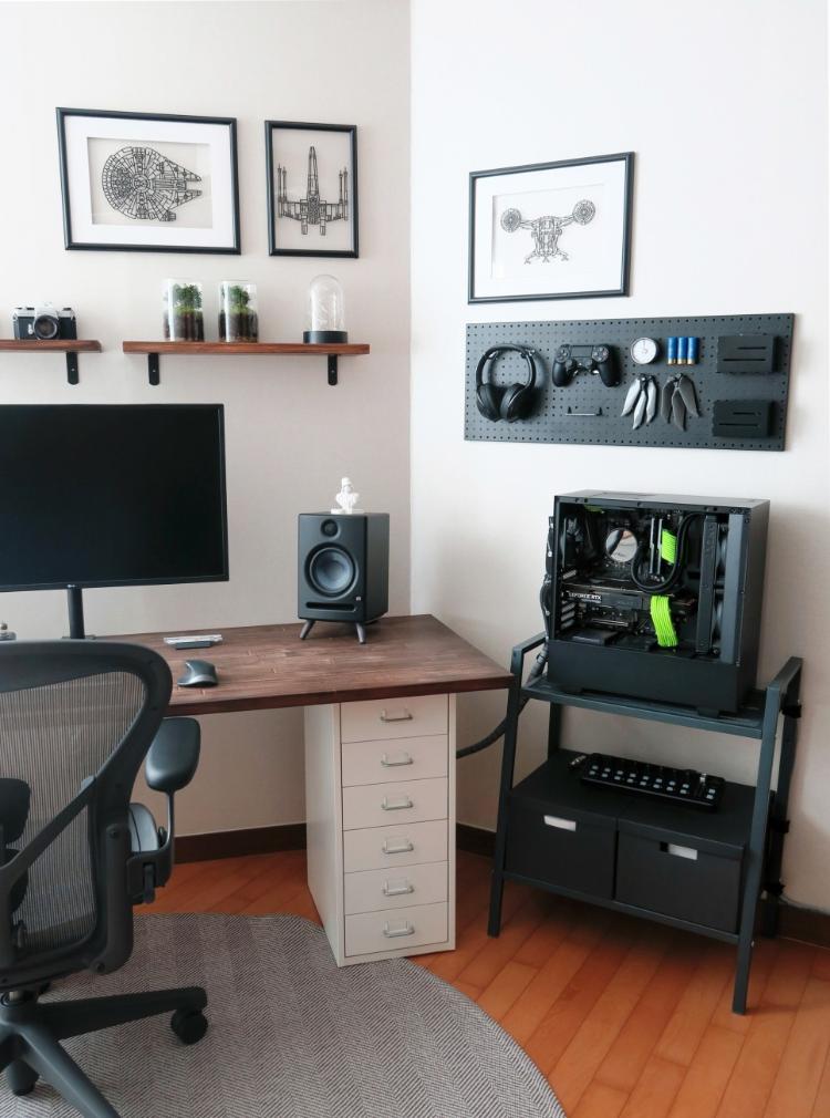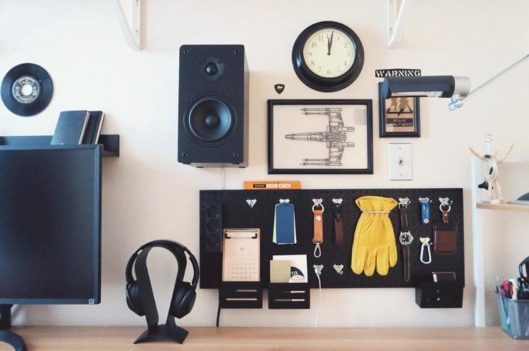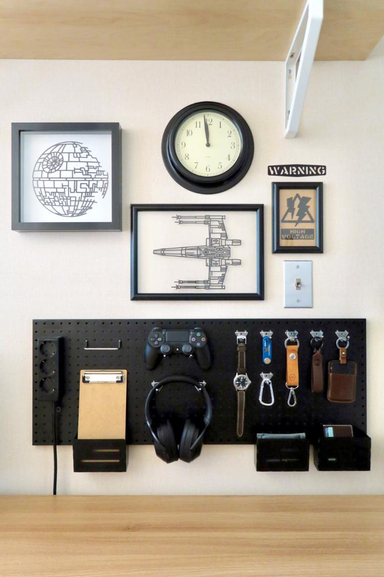 최근 모습입니다. 타공판에 소품을 바꿔 배치하는 건 아직도 하고 있네요.