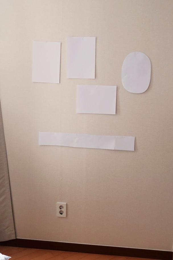 액자 여러 개 배치할 때 꿀팁 - 액자와 같은 크기의 종이를 먼저 붙여보며 레이아웃을 구상해보세요. 감이 확 옵니다.