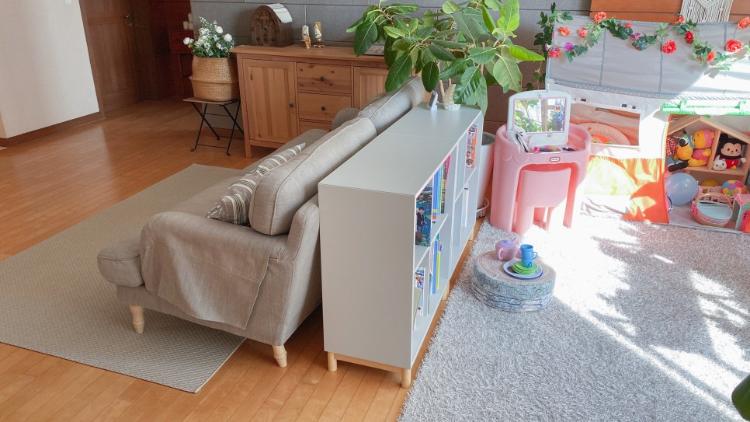 소파와 책장이 서로 등을 맞대고 공간을 나눠주는 역할을 하고 있습니다. 바닥에 널려있는 장난감들도 가려주고요.