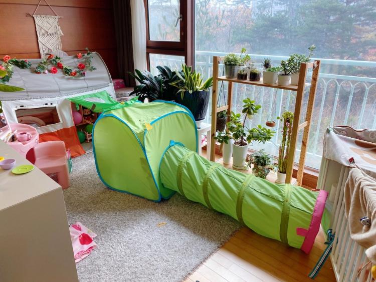 예전에 쓰던 아기침대는 창살을 몇 개 빼고 담요로 덮어 또 다른 플레이 텐트로 만들어 활용하고 있습니다.