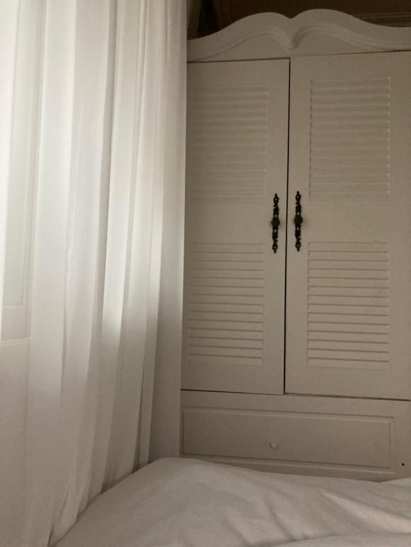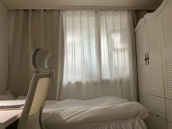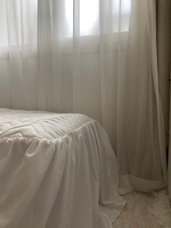 제가 누웠을 때 시야예요. 동향이라 낮에서 저녁으로 넘어갈 때 해가 차르르 들어오는데, 답답하지 않게 화이트 톤의 쉬폰 소재의 커튼으로 바꿔주었더니 딱 기분 좋은 비침 정도로 해가 들어와요.