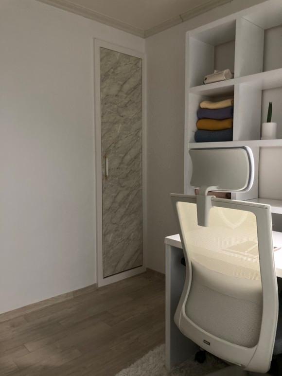 사실 이 붙박이 장은 체리 색 틀에 누런 베이지 색의 붙박이 장이었는데, 이번에 셀프 인테리어를 하면서 대리석 무늬 시트지를 이용해서 고급스러운 무드의 붙박이장으로 리폼해 주었어요. 그전에는 전혀 활용하지 않았던 공간이었는데, 살펴보니 꽤 넓더라구요. 넘쳐나던 짐들을 조금이나마 넣어두어 붙박이장 공간을 활용할 수 있었어요.