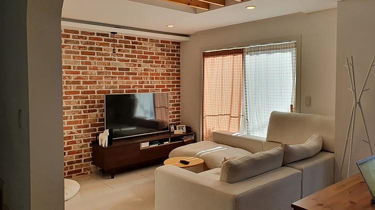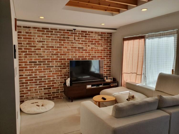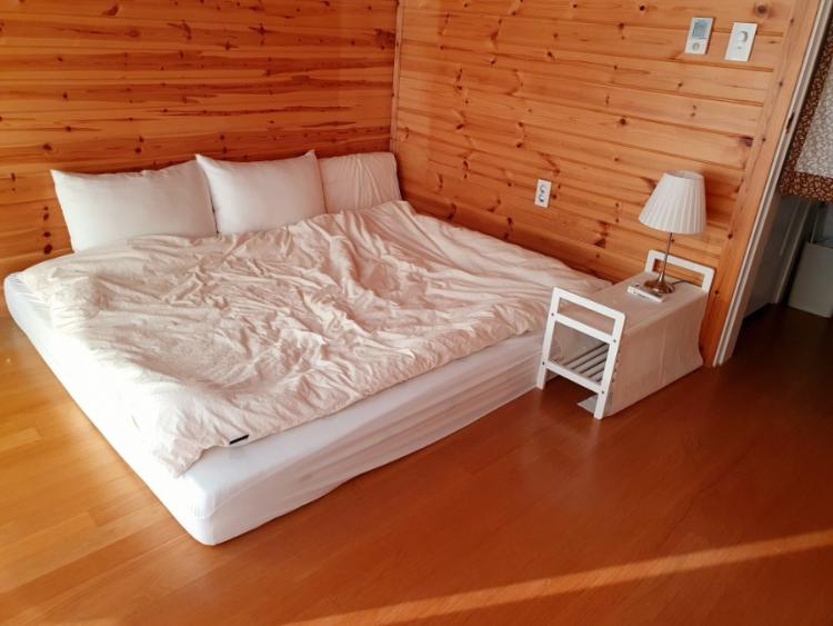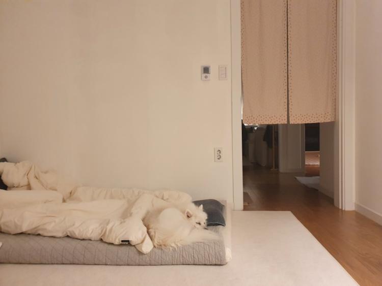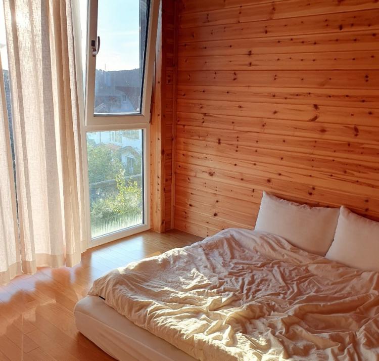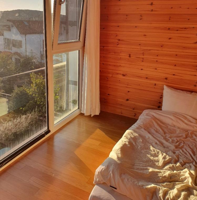 주말에는 늦은 아침까지 햇살을 받으면서 또동, 이쭈와 함께 게으름을 피우면서 힐링해요. 침실은 통나무집에 들어와 있는 듯이 벽면이 나무로 되어있어요. 저희 부부와 반려견 모두 이 공간을 제일 좋아하는 것 같아요.
