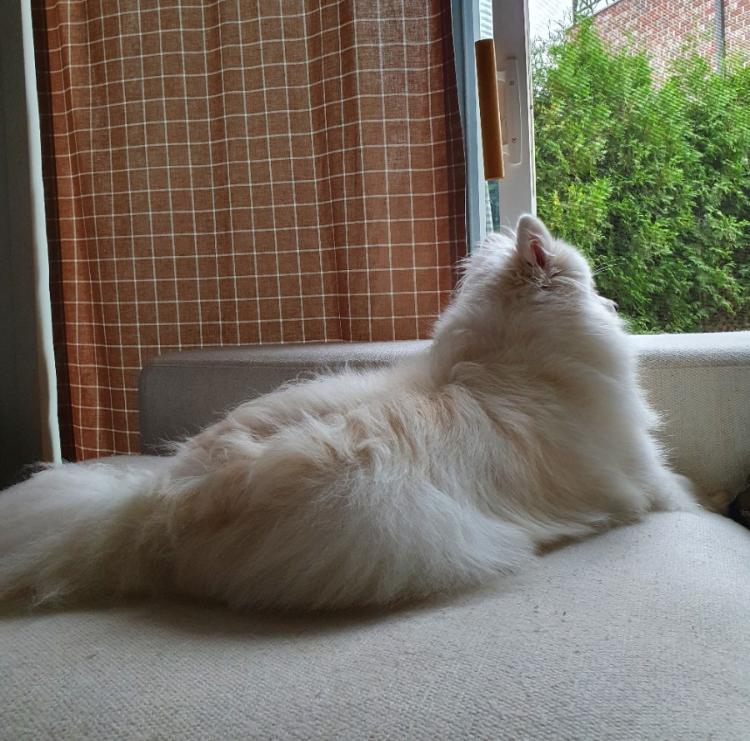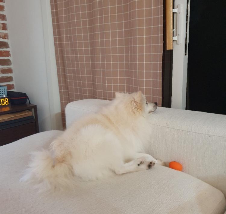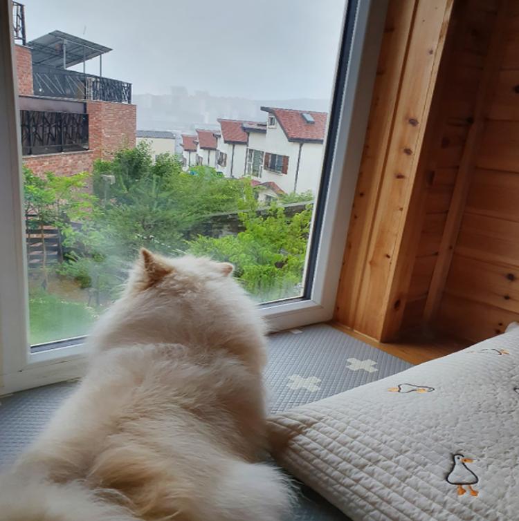 소파 창가 자리는 두 강아지 전용석이에요. 마당이 보이는 최적의 자리랍니다.