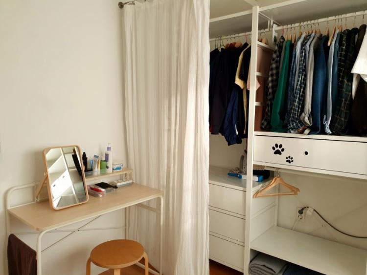 커튼을 이용하여 시스템장과 화장대의 공간을 분리하였어요. 공간이 분리되면 한 개의 공간을 여러 목적으로 사용할 수 있어요.