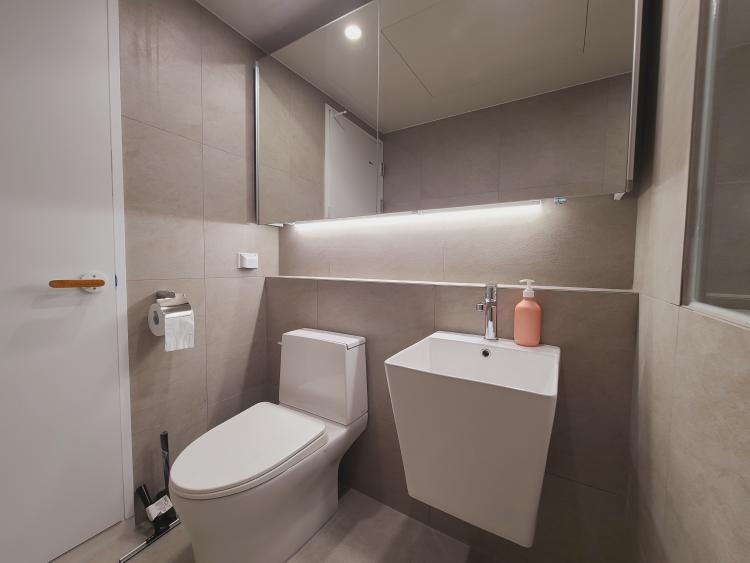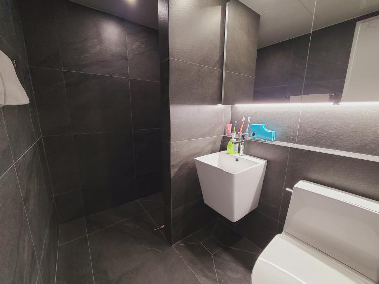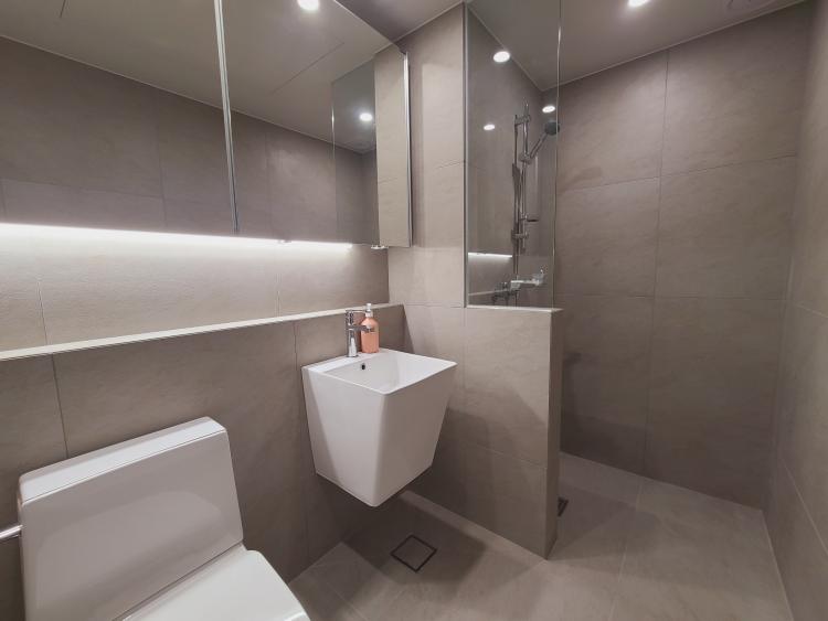 안방 화장실은 조금 더 밝은 타일을 활용해서 세련된 느낌을 줬어요^^ 양쪽 욕실 모두 600*600 대형 타일을 활용해서 조금 더 고급진 느낌이 들도록 시공했답니다.