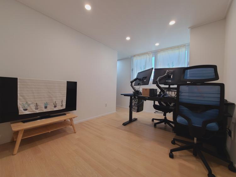 사실 서재라고 썼지만 작업 공간이라고 하는 게 더 맞는 거 같아요^^ 책상의 앞뒤로 의자를 둬서 남편과 저가 각자 작업을 할 수 있도록 배치했고요~