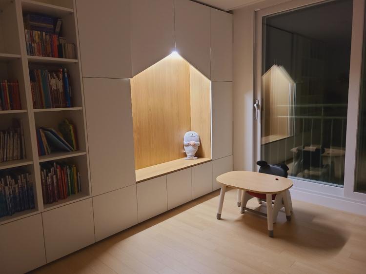 그리고 유일한 저희 붙박이 책장 시공한 곳이기도 한데요^^ 살짝 유행하는 집 모양 벤치를 넣어서 수납장과 책장을 만들어줬어요+.+ 조명도 함께 시공해서 저녁에는 요렇게 됩니다.