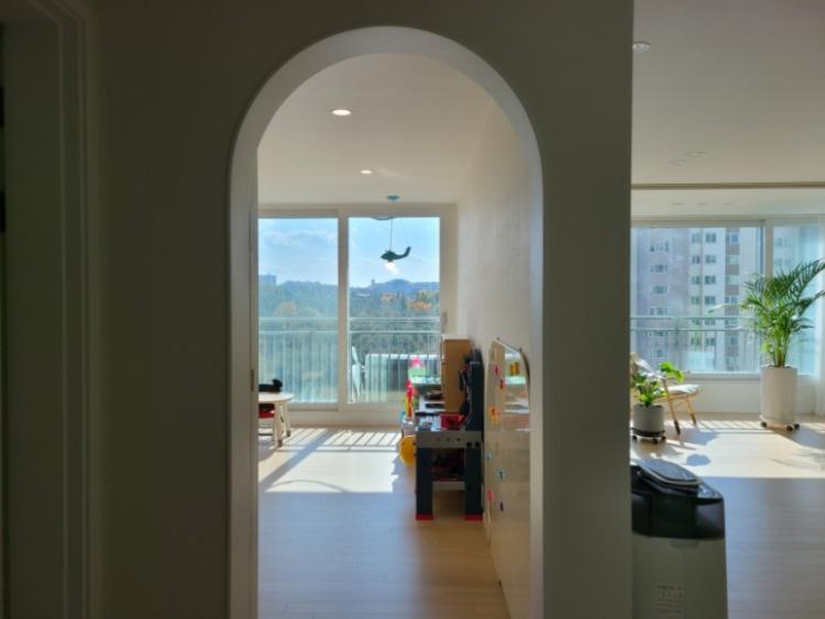 아이방 방문은 슬라이딩 도어로 시공하였어요. 아치 게이트를 만들고 싶기도 했고 아이 방 공간 활용도 하고 싶어서 선택한 방문이에요~