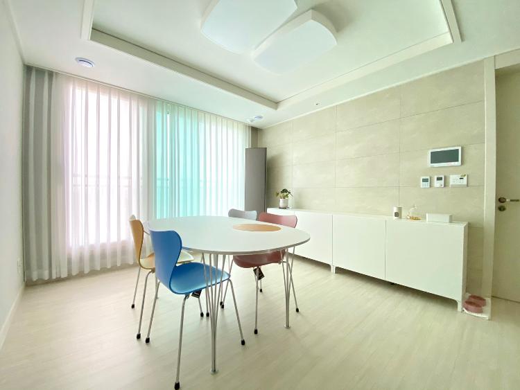 거실엔 TV와 소파를 두는 대신 프리츠 한센의 6인 식탁을 정중앙 두었어요. 지인들을 초대해 맛있는 음식을 해서 나눠먹고, 홈 카페 놀이를 즐겨요. 집을 최대한 밝고, 심플하게 꾸미려고 노력했어요. 기본 벽지와 싱크대가 그레이 색이라 가구는 대부분 흰색으로 구매했더니 조금은 단조로운 느낌이 들어 식탁의자를 각기 다른 색상을 골라 포인트를 주었어요.