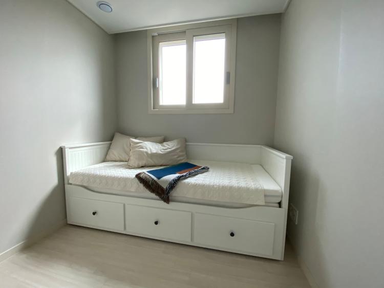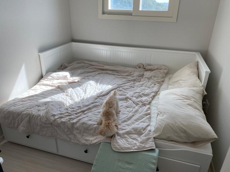 작은방은 제 취미 방이기도 하고, 게스트룸이기도 해요. 이케아 헴네스 데이베드를 들여서, 평소엔 소파로 사용하고, 손님이 오면 침대로 사용합니다. 코로나 때문에 영화관에 못 가는 대신, 빔 프로젝터를 설치해서 침대에 뒹굴뒹굴거리며 영화를 보는 걸 즐기고 있어요.