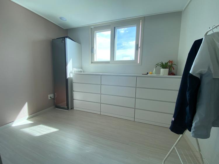 붙박이장이 있는 남은 방 하나는 드레스룸으로 사용합니다. 대부분의 집들은 드레스룸에는 행거를 설치하는데, 창문 밖으로 보이는 뷰가 예뻐서, 행거를 설치하는 것이 아쉽더라고요. 국민 서랍장이라고 불리는 이케아의 말름 4단 서랍장을 이용해서 옷을 정리하고 있는데, 옷을 접어서 보관하니 부피를 차지하지 않아서 좋습니다. 걸어서 보관해야 하는 옷들은 기존에 설치되어 있던 붙박이장이나, 안방에 있는 드레스룸 행거에 보관합니다