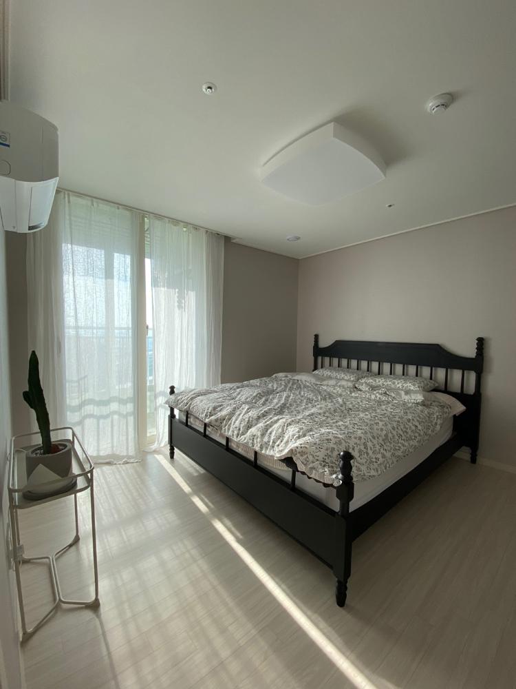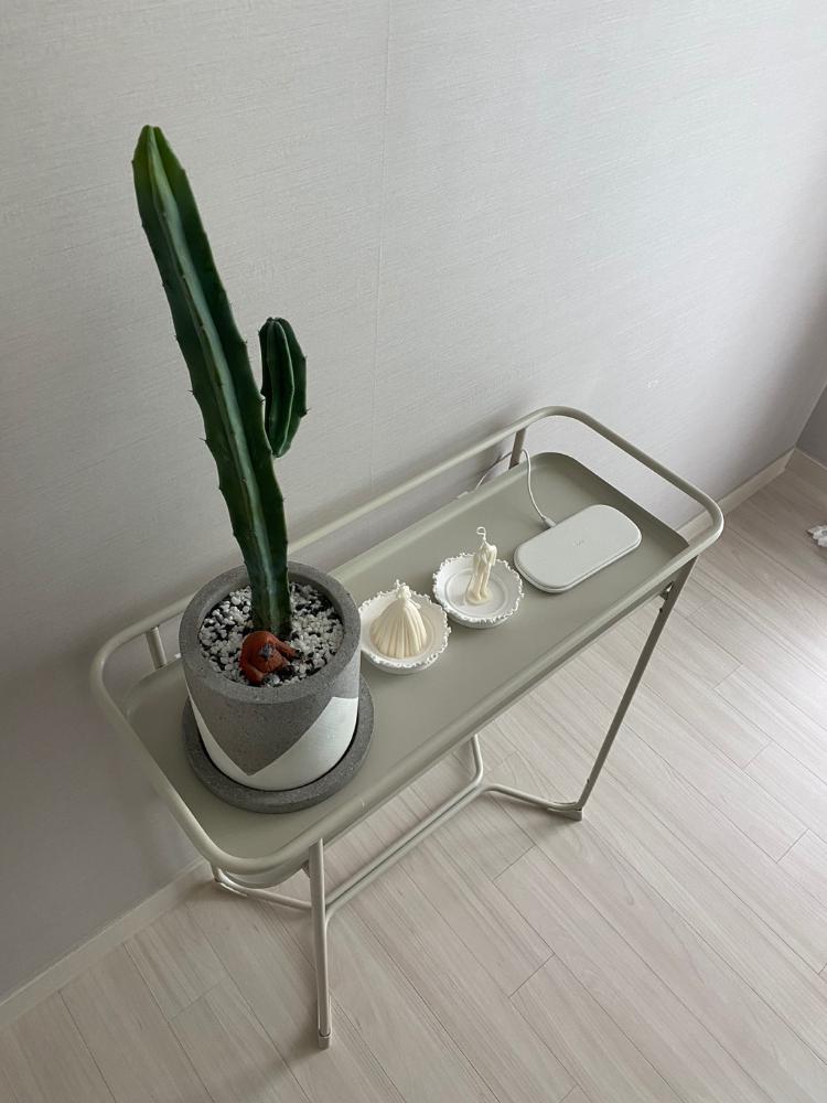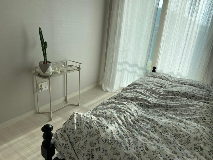 안방은 잠만 자는 공간이에요. 아직은 미완성인 공간입니다. 마음에 드는 사이드 테이블을 고르지 못했는데. 화분 받침으로 쓰려고 샀던 이케아 제품이 방 분위기와 잘 어울려서 집들이 선물로 받은 선인장과 무선 충전기를 올려놓고 콘솔처럼 사용하고 있어요.