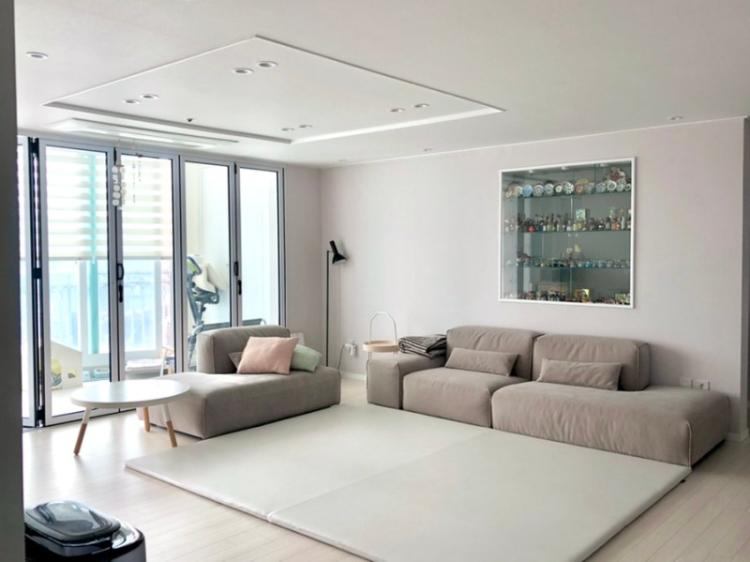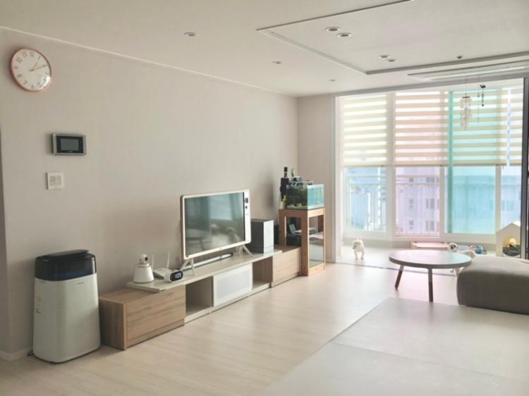 전체적으로 화이트 느낌이지만 너무 차가운 느낌을 주지 않기 위해 거실은 우드 가구를 적절히 활용하였어요. TV 거실장과 수족 관장은 우드로, 소파는 오트밀 색상으로 따뜻한 느낌을 더했답니다.