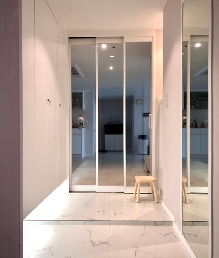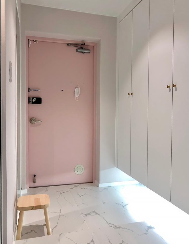 현관이 화사하면 집에 들어섰을 때 기분이 좋을 것 같아 현관문의 안쪽에 핑크색 시트시공을 하였고 바닥타일은 무광 비앙코카라라로 선택했더니 너무 잘 어울렸어요.