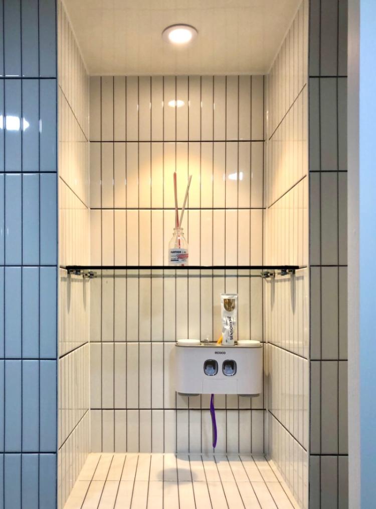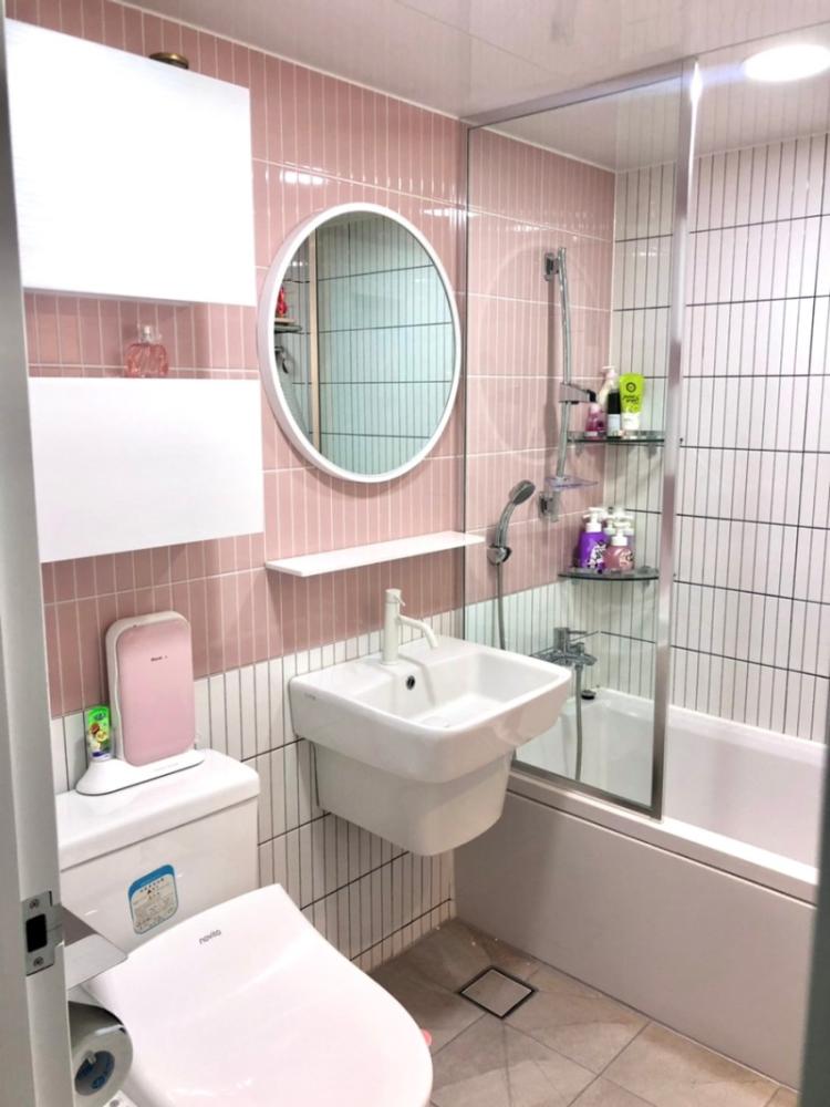 거실 욕실은 아이들이 주로 사용하기에 아이들 취향으로 핑크색 타일로 핑크 욕실을 만들었어요. 둘째가 조금 크면 같이 목욕을 할 수 있게 욕조를 설치하였고 수건걸이는 아이들이 별도의 계단을 이용해 손을 닦지 않아도 되도록 아이들 높이에 맞춰 달았답니다