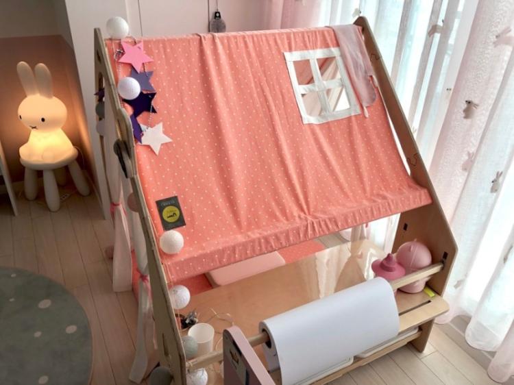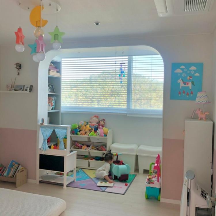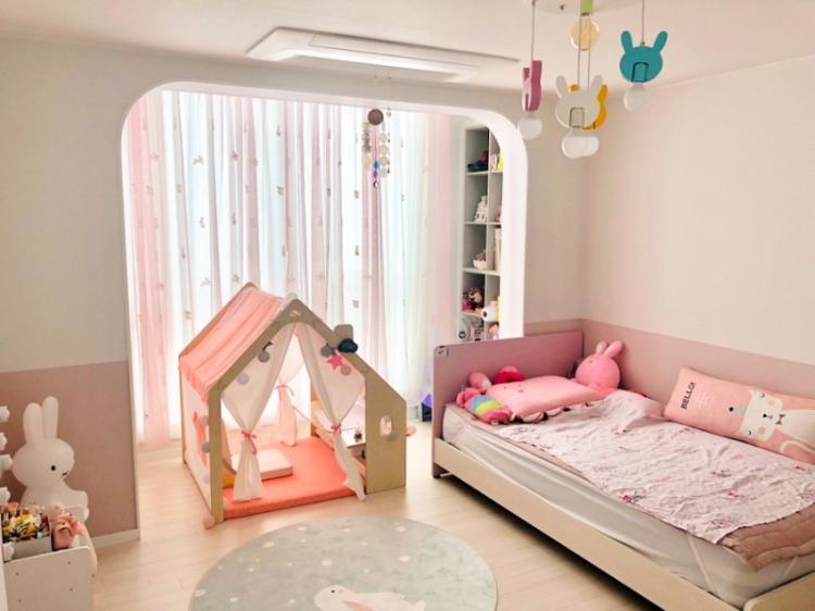 아이가 좋아하는 핑크색 침대, 플레이하우스, 핑크색 토끼 커튼, 토끼 조명등, 토끼 등으로 취향을 살려주었답니다.
