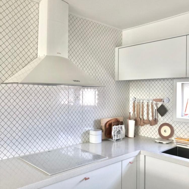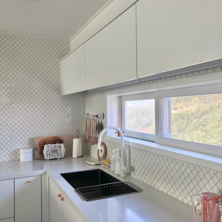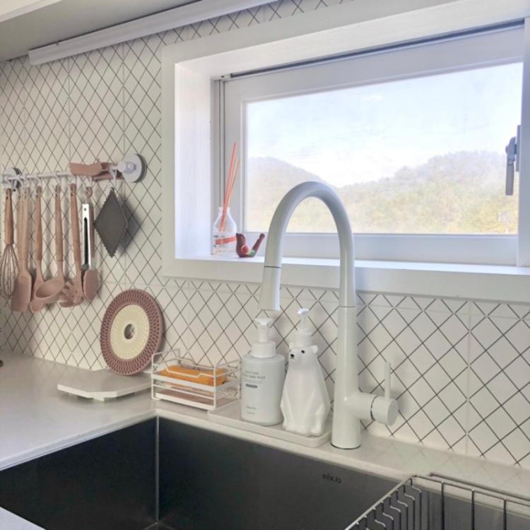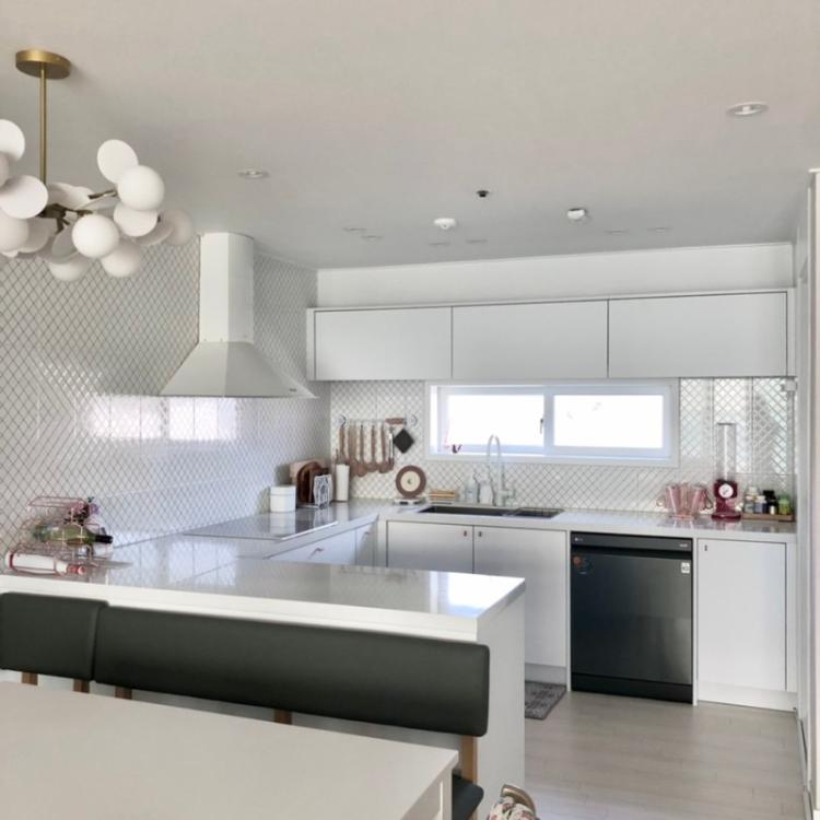 주방의 컨셉은 올화이트로 화이트후드, 화이트수전, 화이트인덕션을 설치했어요. 화이트가 관리가 어렵다고 다들 걱정하셨지만 화이트 주방의 완성은 싱크대뿐 아니라 이런 부속품이지 않을까 싶어요.