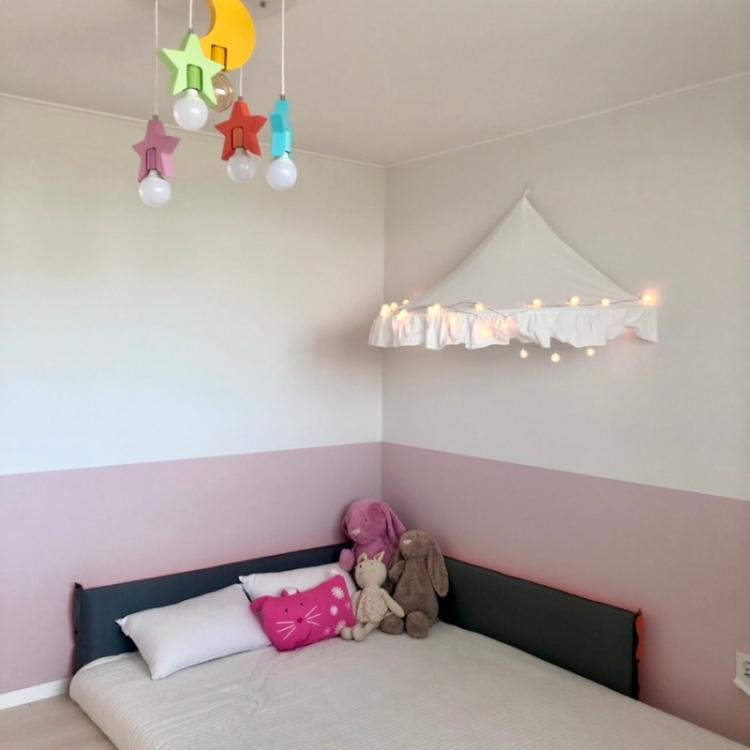 언니 방과 비슷한 느낌을 별 모양 등을 설치했어요. 아직 아기가 어려 낮은 매트리스 토퍼만 깔고 자니 방이 휑한 느낌이 들었는데 벽에 캐노피를 설치하니 조금은 따뜻한 느낌이 들었어요.