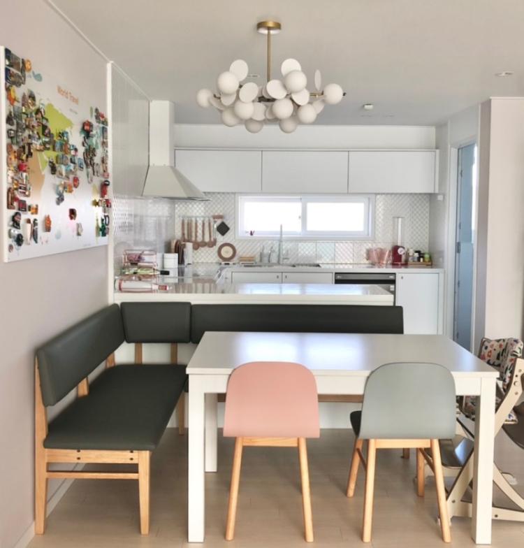 저의 일터이자 아이들과 무엇이든 함께 할 공간인 주방은 부엌일의 동선을 편하게 하기 위해 ㄷ자 싱크대를 제작하였고 식탁에서는 딸아이와 공부도 하고 책도 읽고 만들기나 그리기도 할 수 있도록 코너형 벤치 의자를 놓았습니다.