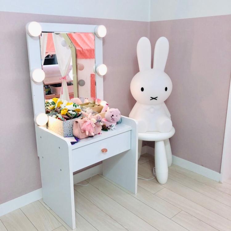아이 방 화장대는 인터넷으로 저렴한 좌식 화장대를 놓았고 손잡이는 가구 설치 시 남았던 손잡이가 있어 교체해 주었어요. 그리고 코스트코에서 퍽 라이트를 구매해 화장대를 꾸며주었더니 고급 화장대 느낌이 물씬 나요^^