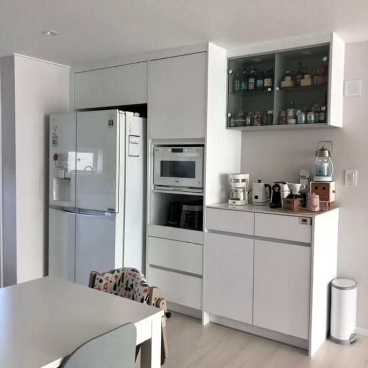 주방은 무광 화이트싱크대로 ㄷ자 싱크대를 설치해 수납공간이 충분했기에 상부장은 플랫장으로 3개만 놓았답니다. 원래는 가스후드가 지금의 플랫장 가장 오른쪽 다용도실 문앞에 위치하고 있었는데 인덕션을 놓으면서 위치를 변경했기에 깔끔한 상부장이 가능했어요.