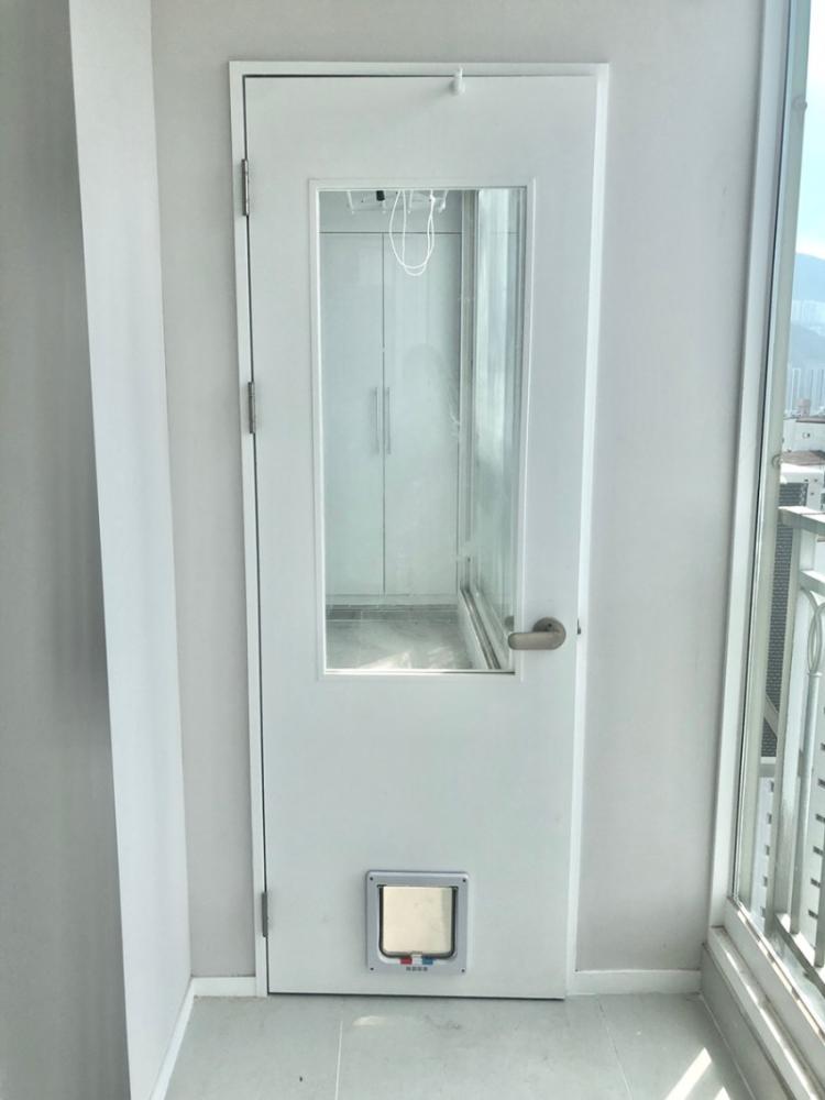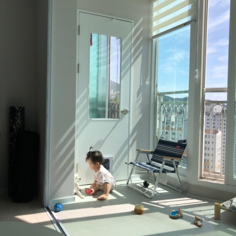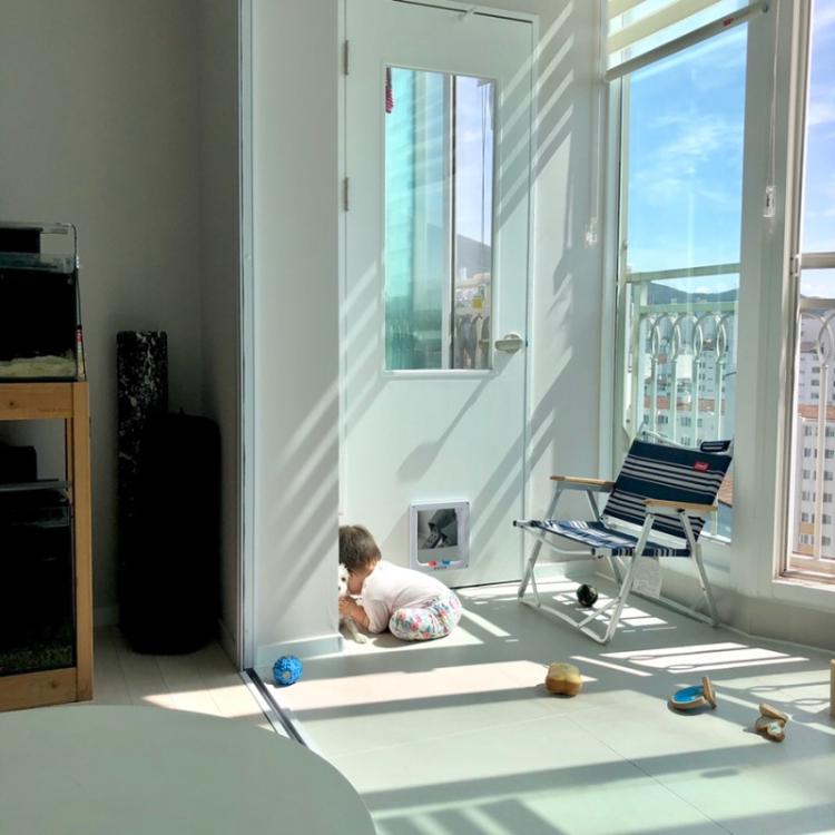 그리고 원래는 이런 문이 없이 길쭉한 베란다였는데 중간에 문을 달고 문 뒤로는 강아지 화장실을 만들고 펫 도어를 설치해 강아지 배변 판 냄새도 잡아주었답니다. 반려견을 키우시는 분들께 정말 추천드리고 싶어요.