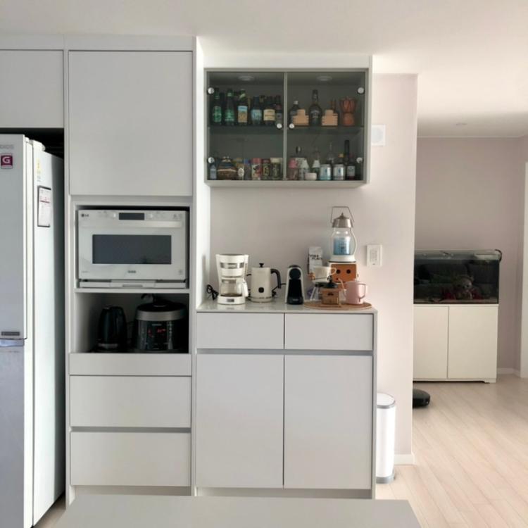 여기는 주방 키 큰 장이 있는 쪽이에요. 냉장고는 정수기 냉장고로 2015년 1월에 구매한 제품이에요. 신혼이었던 당시 25평 아파트에 공간이 좁아 선택했던 정수기 냉장고인데요. 많은 공간을 차지하지 않고 얼음도 매일 먹을 수 있어 저희 집 1등 가전이랍니다.