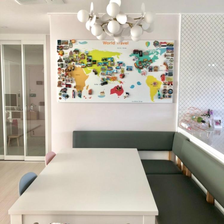 식탁 벽에는 그림을 걸까 하고 생각하던 차에 남편이 여행&출장 때마다 모았던 각국의 마그네틱을 붙이기로 했어요. 그래서 인터넷으로 세계지도 철판을 주문했고 거기에 자석을 붙였답니다.