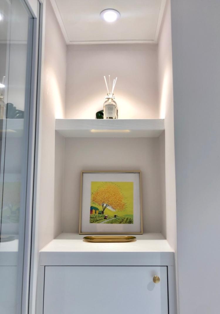 확장한 부분에는 우산을 넣을 수 있는 우산장과 선반을 설치하였습니다. 선반에는 디퓨저와 액자, 트레이 등 인테리어 소품을 활용해 편안하고 따뜻한 현관의 느낌을 더했답니다.