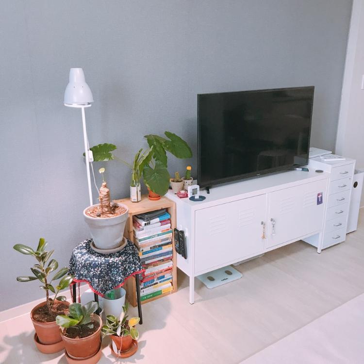 이사 오면서 43인치 TV를 구입했어요. 저는 TV를 잘 보지 않는 사람인 줄 알았는데, 큰 TV와 소파가 생기니까 TV 보는 시간이 너무 즐겁습니다. 요즘 소소한 행복 중의 하나는 TV 보면서 소파에 누워서 졸기입니다^^ TV 옆은 저희 집 식물들의 중환자실입니다;; 정북향이다 보니 식물들이 다 시름시름 앓아서 돌아가면서 식물 등을 쪼여주고 있어요ㅜㅜ