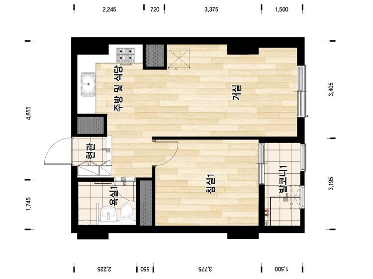 저희 집은 36형 행복주택으로 방 한 개와 거실이 있는 구조입니다. 확장형이어서 거실 베란다가 없는 대신 같은 평수의 다른 집보다 거실과 방이 넓은 편이랍니다.