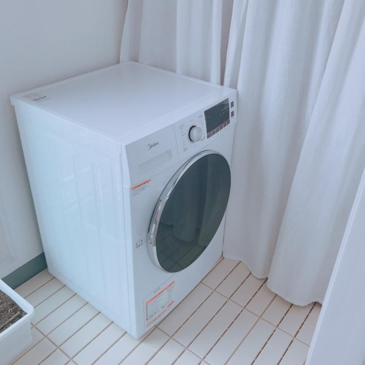 방에 있는 작은 발코니는 다용도실로 사용하고 있어요. 바닥에 조립식 데코타일을 깔아서 세탁기와 건조기를 사용할 때 신발을 신지 않도록 했어요. 에어컨 실외기, 세탁기, 캐리어 같은 큰 짐들은 저 커튼 뒤에 숨겨두었습니다.
