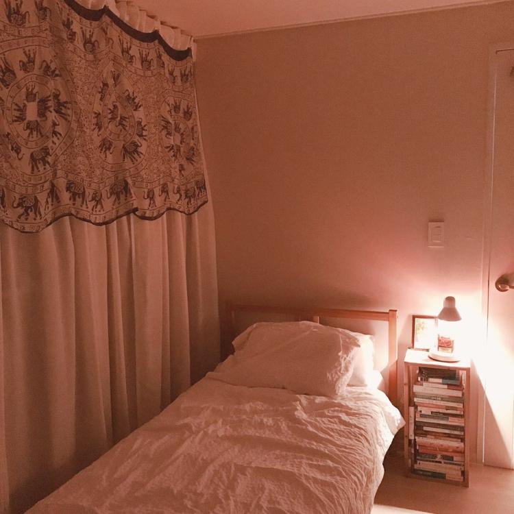 잠을 자는 공간은 최대한 심플하게 해서 숙면을 취할 수 있도록 했어요. 침대 옆쪽 벽면은 행거를 두어 옷을 수납하고 커튼으로 가벽처럼 만들었어요. 지저분한 것을 가려주니 방이 더 아늑하고 잠도 솔솔 온답니다.