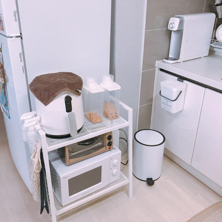 냉장고 옆 선반에는 전자레인지, 에어프라이어 같은 소형 전자제품들을 모아두었어요. 저의 삼시 세끼를 책임지고 있는 귀한 녀석들입니다. 특히 정수기를 구입하고 삶의 질이 달라졌어요. 생수를 사서 마실 때보다 물을 자주 마시게 되어서 건강해진 기분입니다!