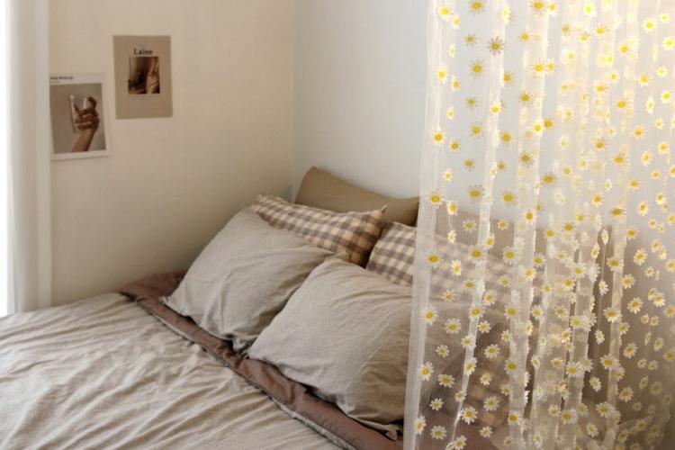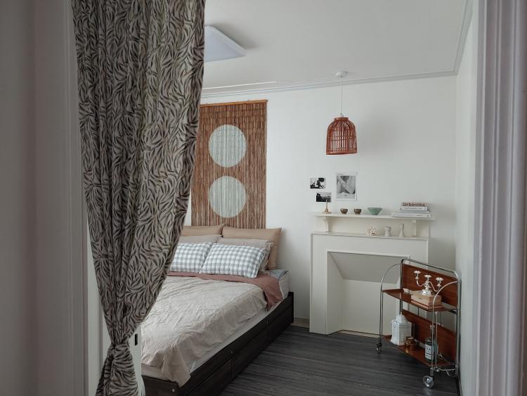 원래는 침대 캐노피를 다는 것도 로망 중에 하나였는데, 그런 로망은 침대 옆으로 커튼을 다는 것으로 만족하기로 했어요. 비치는 커튼으로 하니 답답하지 않으면서도 또 다른 공간을 만든 것 같아서 참 좋더라구요.