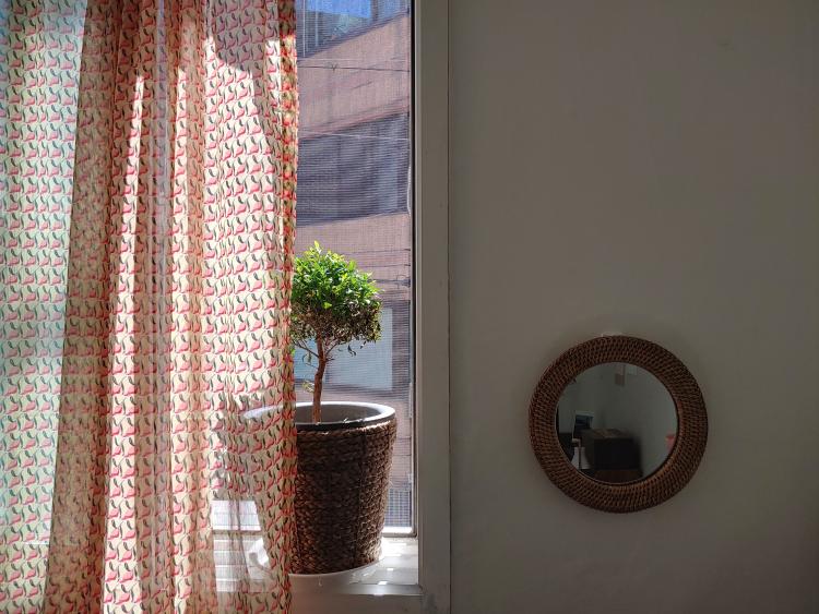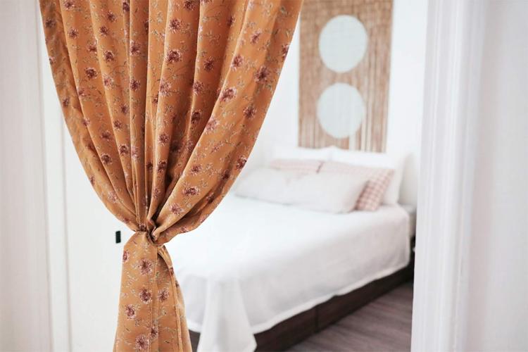계절에 따라, 무드에 따라 포인트가 되는 커튼 뒤로 침실을 보여드릴게요. 가장 자주 분위기의 변화를 주는 공간인 침실, 단연코 저희 집 포토존이라고 할 수 있답니다!