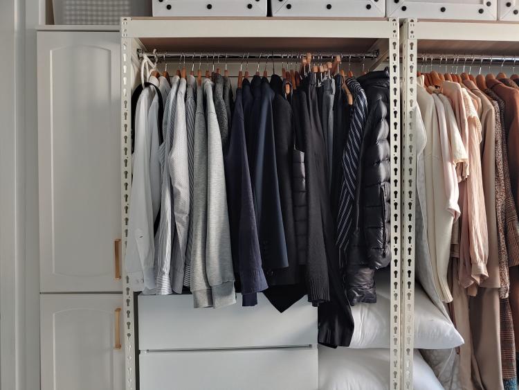 옷장은 개방형이라 화이트 커튼으로 가려 두었고, 틈새 수납장까지 딱 맞게 들이고 나니 훨씬 더 정돈된 느낌이죠? 틈새 사이즈에 맞게 수납장을 선택할 수 있어서 정말 좋았어요.