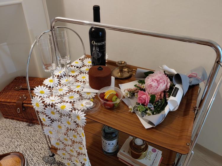가끔 테이블을 두고, 또는 오랜 세월이 묻어나는 트롤리에 차려놓고 디저트타임을 갖기도 해요. 멋진 사진 한 장 남기려면 예쁘게 셋팅 하는게 먹는 것보다 오래 걸리지만요.