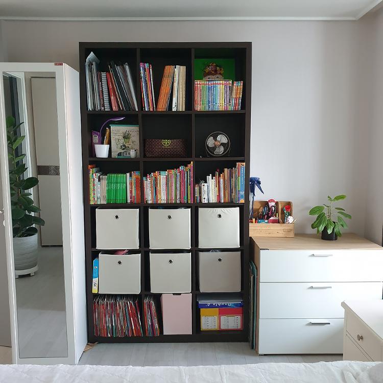 최근에 커다란 책장의 책들을 지인, 당근 마켓, 알라딘을 통해 처분하고 현재 읽고 있는 책들과 간이 화장대처럼 화장품, 공간박스로 드라이어, 컬링 기를 두어 정리했어요. 햇살이 너무 강하게 드는 방이라 우리 집에 유일하게 블라인드가 있는 방이에요.